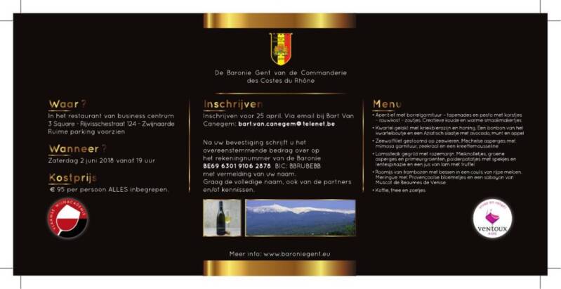 De Baronie Gent van de Commanderie des Costes du Rhône probeert elk jaar opnieuw iets unieks te creëren rond en met de beste rhônewijnen. Voor de neofieten organiseren wij leerrijke masterclasses, voor de jonge enthousiaste wijnlovers hebben wij degustatieconcepten ontworpen, voor de epicuristen onder ons gaan we voor een hoogstaand culinair kapittelbanket. Voor elk wat wils, waar telkens de kracht en de finesse van de rhônewijnen centraal staan.