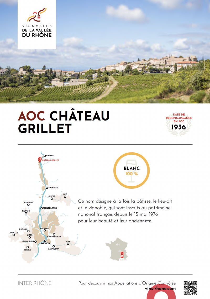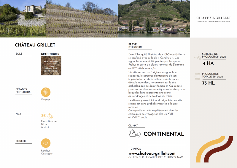 - Geschiedenis: bestaat al sinds de Romeinse bezetting. Chateau Grillet is een cru monopole. AOCdecreet 8 december 1936. De Familie Neyret-Gachet was eigenaar sinds 1830, maar in 2011 heeft François Pinault, topman van het Franse luxeconcern LVMH, het domein gekocht.