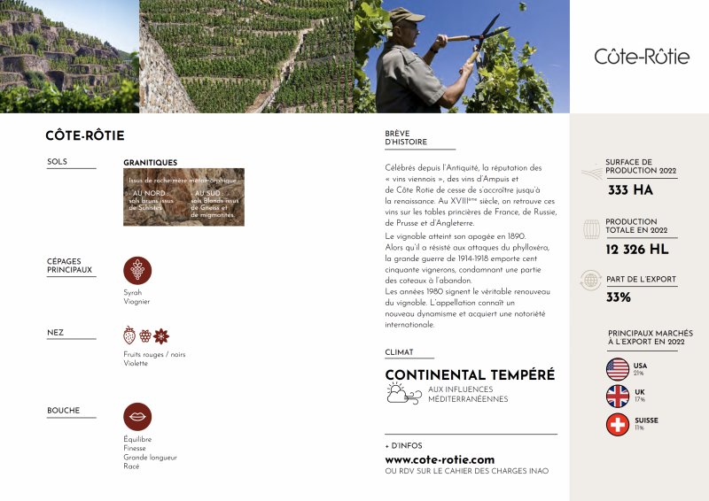 - Geschiedenis: een der oudste wijngebieden van Frankrijk. Côte-Rôtie werd verheven tot AOC in 1940. Momenteel is er een instantie opgericht ter bescherming van het genetisch erfgoed van de syrah druif. In de voorbije 10 jaar werden er meer dan 650 klonen bestudeerd