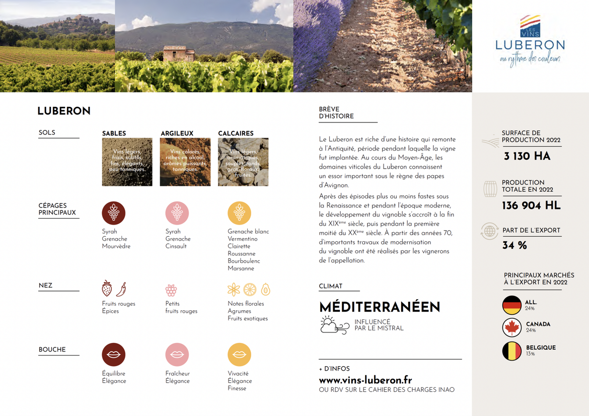 - Appellation: in 1951 werd het VDQS-label toegekend, in 1988 werd het statuut AOC C0tes du Luberon verkregen dat In 2009 gewijzigd werd in AOC Luberon, nadien in AOP Luberon.