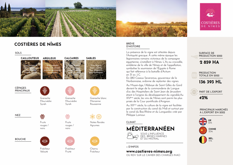 - Wijngaard: ligging op de rechteroever Rhône in de omgeving van Nîmes. AOP Costières de Nîmes kan in 24 gemeenten geproduceerd worden: Aubord, Beaucaire, Beauvoisin, Bellegarde, Bernis, Bezouce, Bouillargues, Le Cailar, Caissargues, Garons, Générac, JonquièresSaint- Vincent, Lédenon, Manduel, Meynes, Milhaud, Nîmes, Redessan, Rodilhan, Saint-Gilles, Sernhac, Uchaud, Vauvert, Vestric-et-Candiac. B