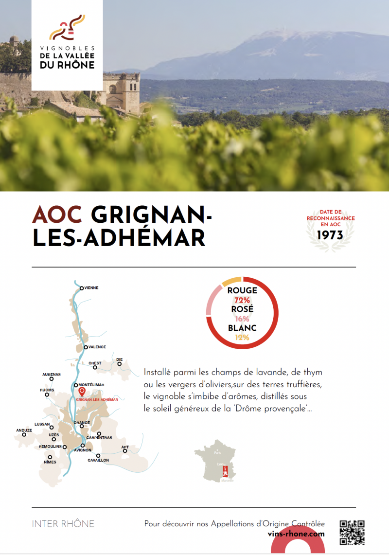 - Wijngaard: ligging op de linkeroever van de Rhône rond Grignan. AOP Grignan-les-Adhémar kann in 22 gemeenten geproduceerd worden