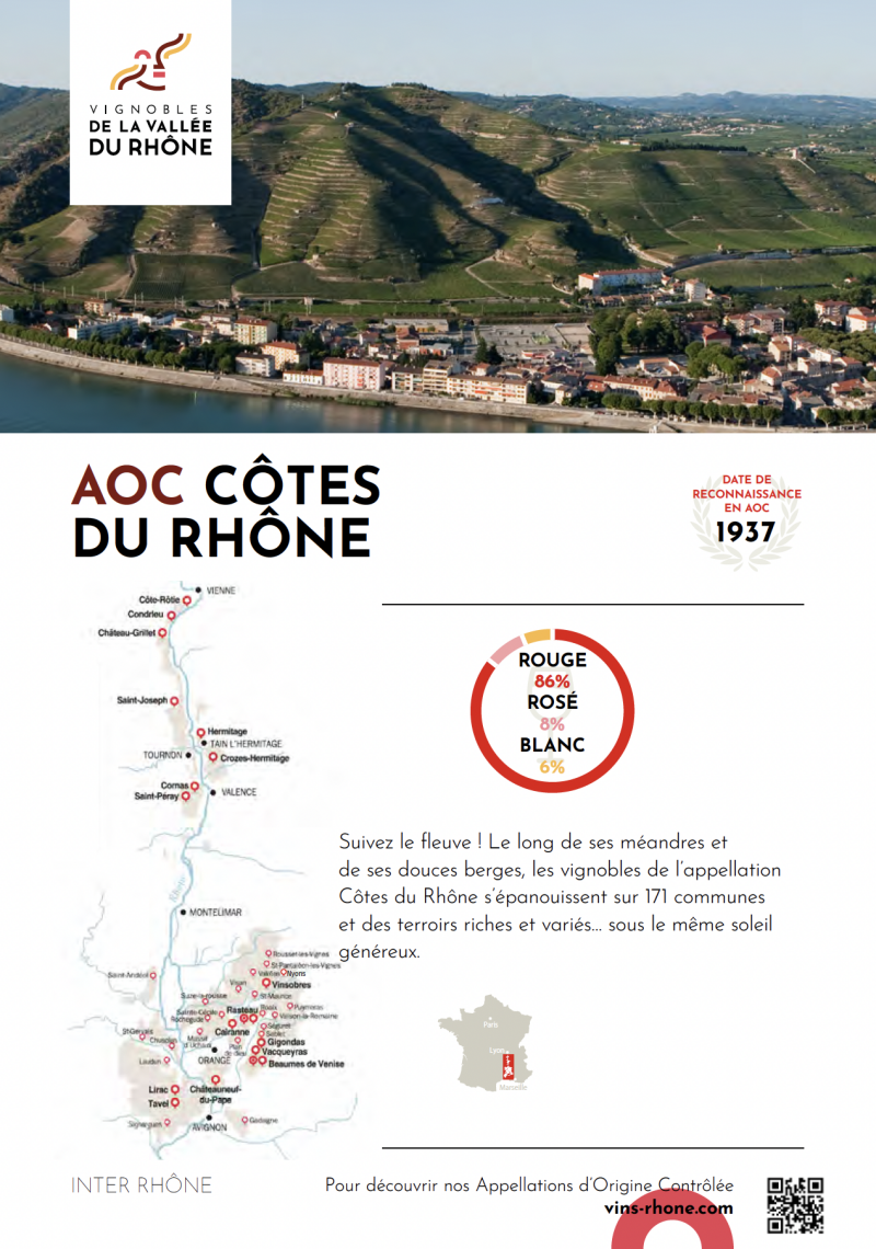 Door zijn ligging aan beide zijden van de Rhöne tussen Vienne, Valence en Avignon, ontleent de appellation Cötes du RhOne zijn persoonlijkheid aan de enorme veelzijdigheid aan bodemsoorten, klimaatzones en druivenrassen.